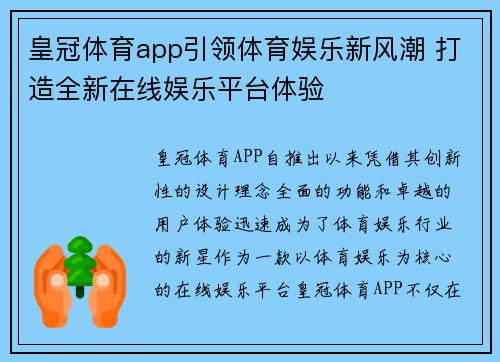 皇冠体育APP自推出以来,凭借其创新性的设计理念、全面的功能和卓越的用户体验,迅速成为了体育娱乐行业的新星。作为一款以体育娱乐为核心的在线娱乐平台,皇冠体育APP不仅在体育赛事直播、体育博彩、虚拟竞技等多个领域为用户提供丰富的娱乐体验,还不断提升其技术架构,推动在线娱乐平台的创新发展。本文将从四个方面详细探讨皇冠体育APP如何引领体育娱乐新风潮,打造全新在线娱乐平台体验。具体来说,我们将分别探讨其创新的用户体验、丰富的体育项目选择、智能化的赛事分析及预测系统,以及强大的安全保障措施。这些方面共同构成了皇冠体育APP在竞争激烈的市场中脱颖而出的原因。